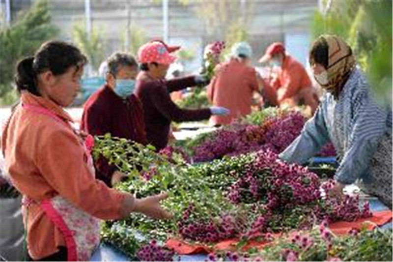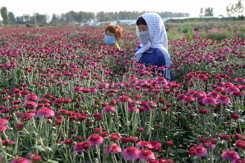 10月23日,山东省滨州高新区农民在采摘菊花。进入霜降节气以来,山东省滨州高新区青田街道办事处花卉基地内300余万株菊花竞相绽放,贫困群众抢抓农时采摘、加工、包装菊花,到处一派繁忙景象。据了解,该基地菊花试种的“扶贫菊花”面积达100亩,有90余个品种,主要销往北京、上海、广州等一线城市,成为群众增收致富的好渠道。 中新社发 初宝瑞 摄